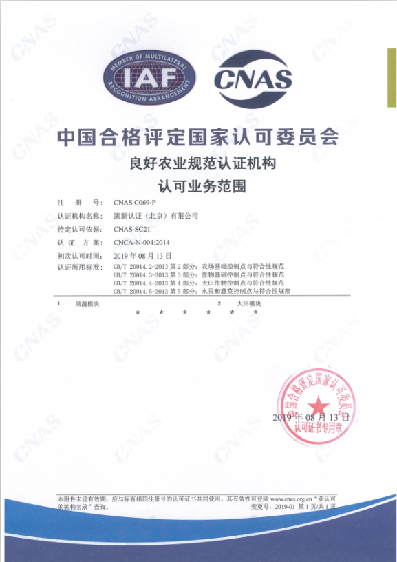 2019年8月13日,有機和良好農業規范認證(GAP)領域獲得CNAS認可資格。認可范圍范圍包括: