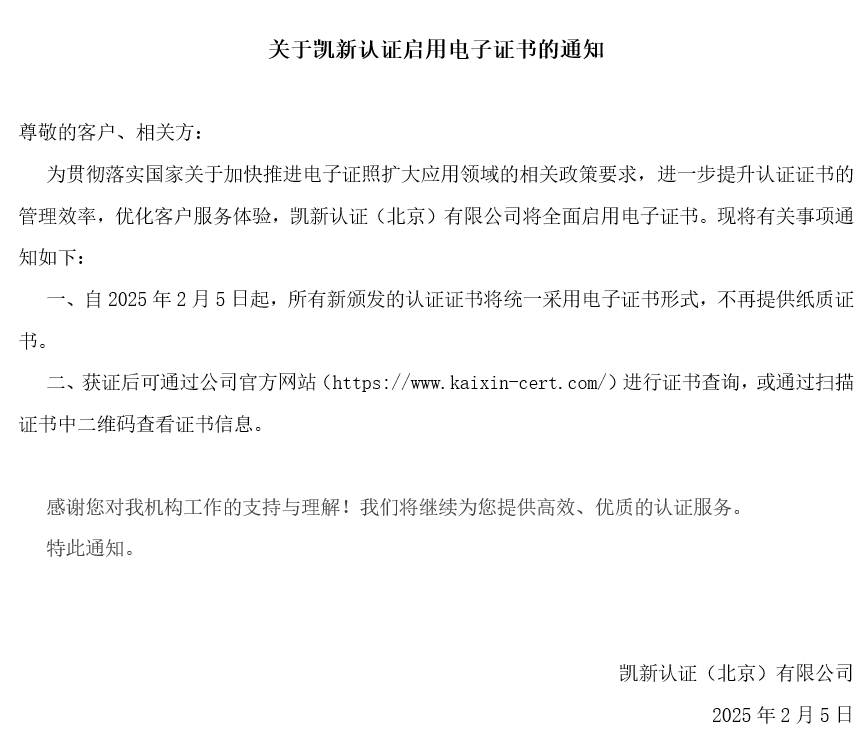 為貫徹落實國家關于加快推進電子證照擴大應用領域的相關政策要求,進一步提升認證證書的管理效率,優化客戶服務體驗,凱新認證(北京)有限公司將全面啟用電子證書。現將有關事項通知如下252025-02